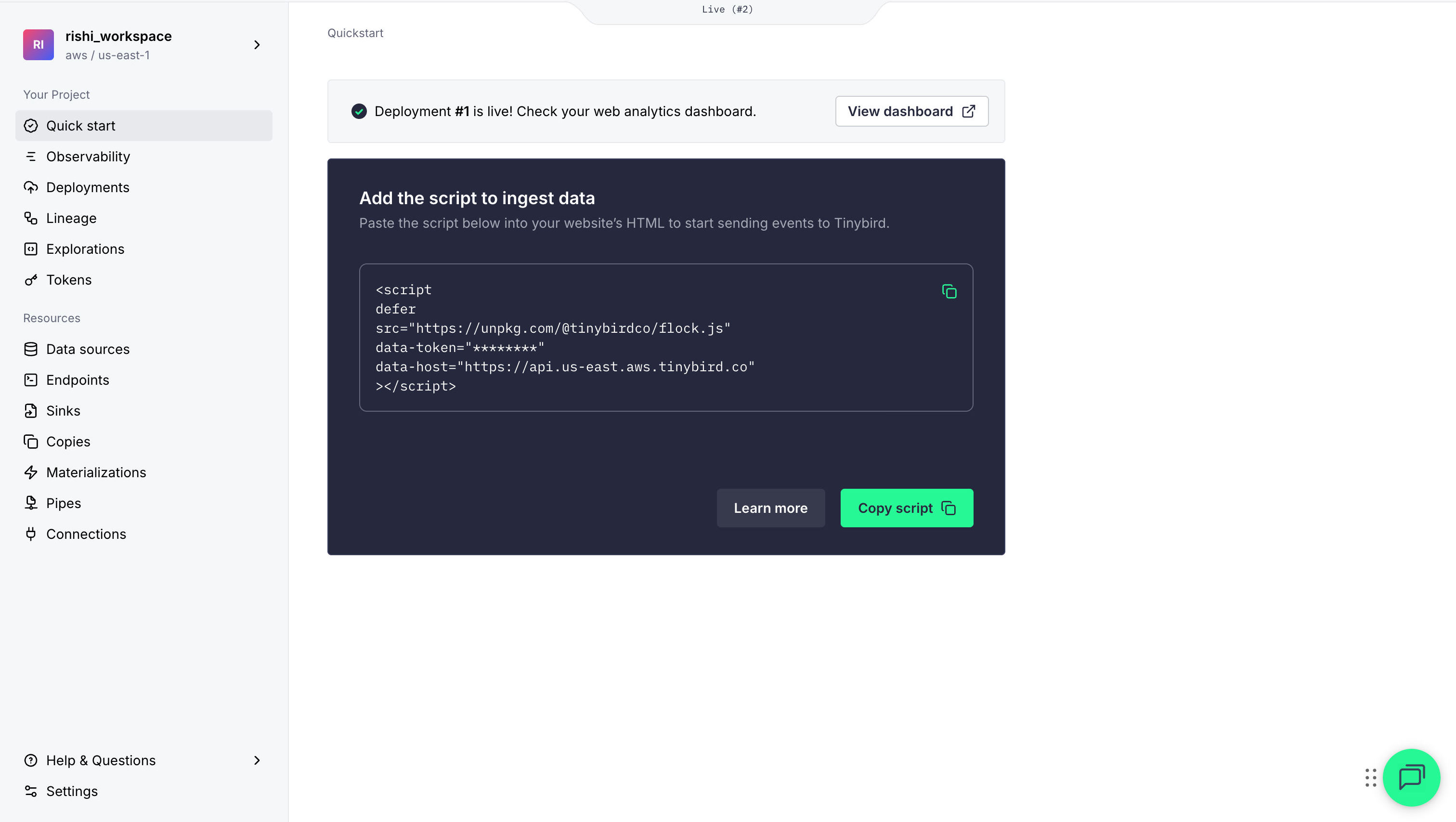 Open the Tinybird console and copy the tracking script using the Copy script green button.